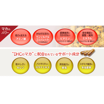 「DHCマカ」は、マカの濃縮エキス末を1日の目安量に405mg含むサプリです。また、サポート成分としてセレン・ガラナエキス・亜鉛・冬虫夏草が配合されています。。