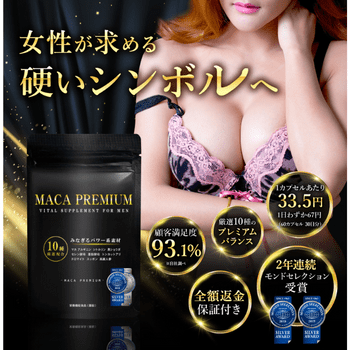 「MACA PREMIUM」は、純度にこだわり本場ペルー産のマカを使用したサプリです。亜鉛・すっぽんエキス・黒しょうが・シトルリン・アルギニンなど10種の元気成分もバランス良く配合しています。