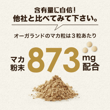 オーガランド「マカ粒」は、本場ペルー産のマカ粉末を1日の目安量3粒に873mg配合しています。マカだけを摂取したい方におすすめのサプリです。
