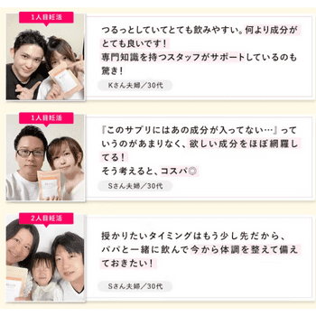 ”本当に妊活中に摂取するべき栄養素だけ”が厳選されています!葉酸がやっぱり大事と言われてますが、葉酸も入ってるし色んな必要な栄養素がいっぱい! 特に”夫婦で飲める”のが嬉しい。やっぱりきちんと必要な栄養を摂りたいですよね。妊活中の方や妊婦さんの味方のサプリです!