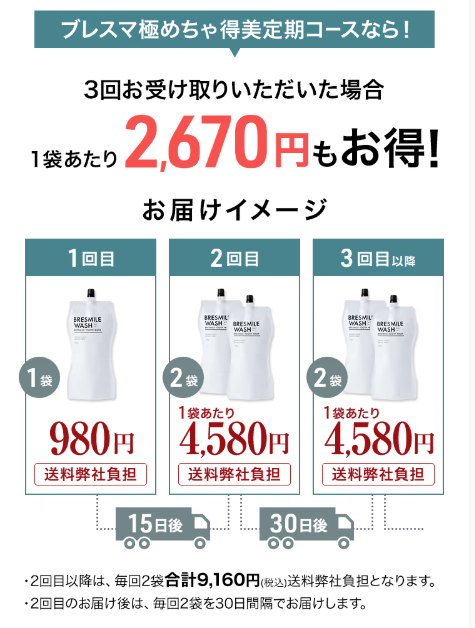 定期購入を選んでも継続回数の縛りはないため、気軽に申し込めるところも嬉しいポイントです。ブレスマイルウォッシュを買うなら公式サイトの定期コースを選ぶのが断然お得です。