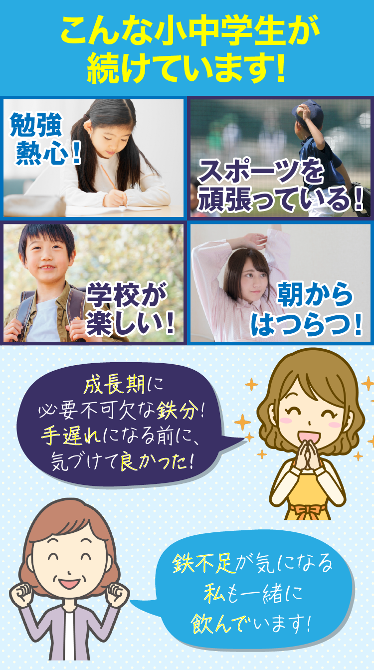 飲みはじめて、まるで別人。遅刻やイライラが減った! Sさん娘15歳 中3の娘は、朝なかなか起きれず、いつも不機嫌でした。学校へ行く準備も遅くて遅刻ぎみだったり、気分の浮き沈みが激しく、親子関係もぎくしゃく…。そんな時、こちらの商品を知り、すぐに購入。飲んだすぐから、別人のようになりました。今は朝もすぐに起きれて、イライラもしていないように思います。 以前の娘は、きっと鉄分不足だったんですね…。これからも続けて飲ませてみたいと思います。 ※愛用者の感想であり、商品の効能・効果を表すものではございません。