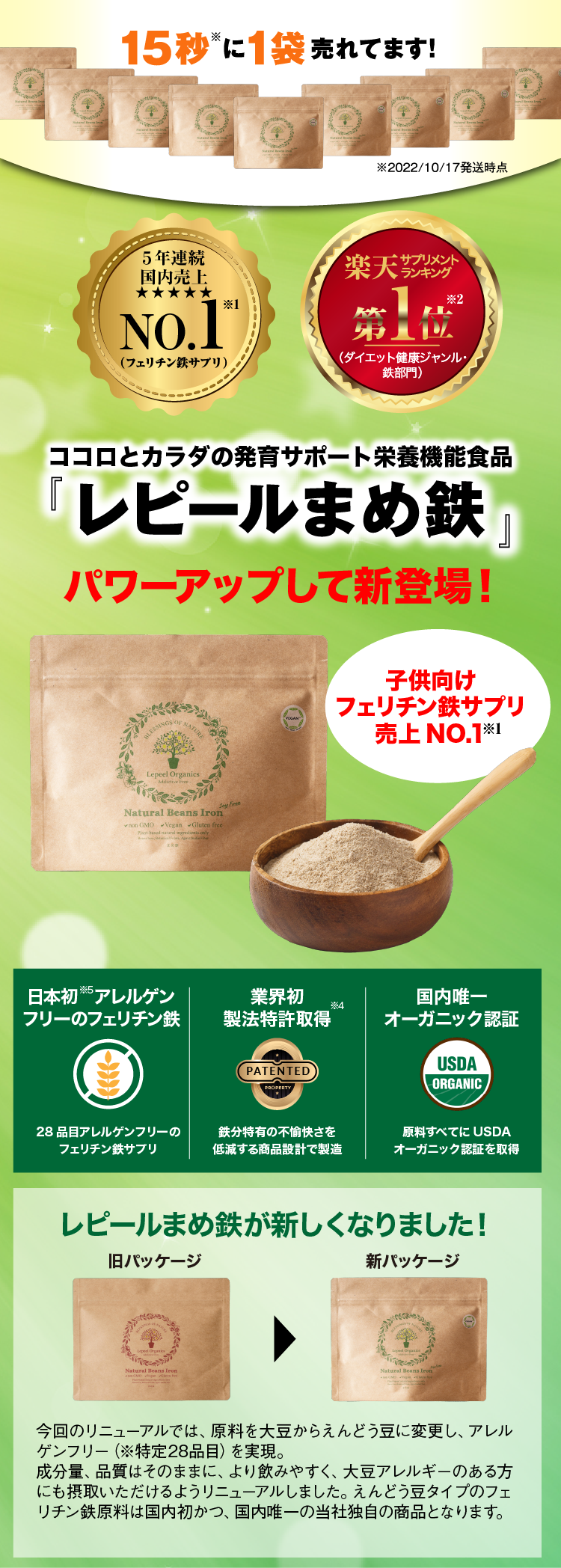 15秒※に1袋売れてます!※2022/10/17発送時点 累計販売数アジアNO.1!※1 世界初※2!フェリチン鉄配合! ココロとカラダの発達サポート栄養機能食品 『レピールまめ鉄』