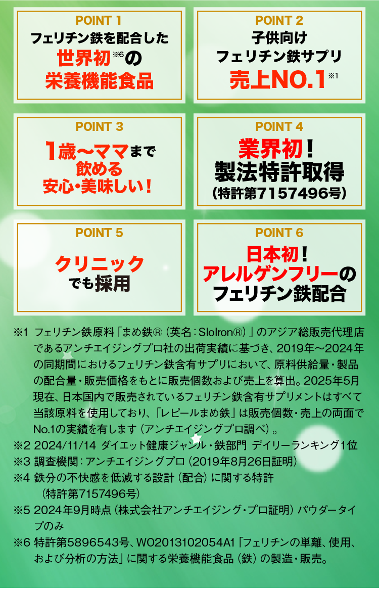 完全無添加&100%オーガニック 日本ヴィーガン協会 ヴィーガン認証取得済 POINT 1 フェリチン鉄を配合した 世界初※2の栄養機能食品 POINT 2 子供向け フェリチン鉄サプリ 売上NO.1 ※1 POINT 31歳~ママまで飲める安心・美味しい! POINT 4国際特許取得 ※3(特許第5896543号)POINT 5 医師も推奨! 病院でも採用 POINT 6 ヒト臨床試験済み※4で安心! ※2,3 特許第5896543号、WO2013102054A1「フェリチンの単離、使用、および分析の方法」に関する栄養機能食品(鉄)の製造・販売。 ※1 調査機関:株式会社アンチエイチングプロ(2023年4月14日証明)2017~2022 年における年間商品販売量(供給量)において、日本を含むアジア圏で最も多い量を販売。 ※4 本原料(まめ鉄®)にて2021年日本人女性を対象に試験実施。今だけ