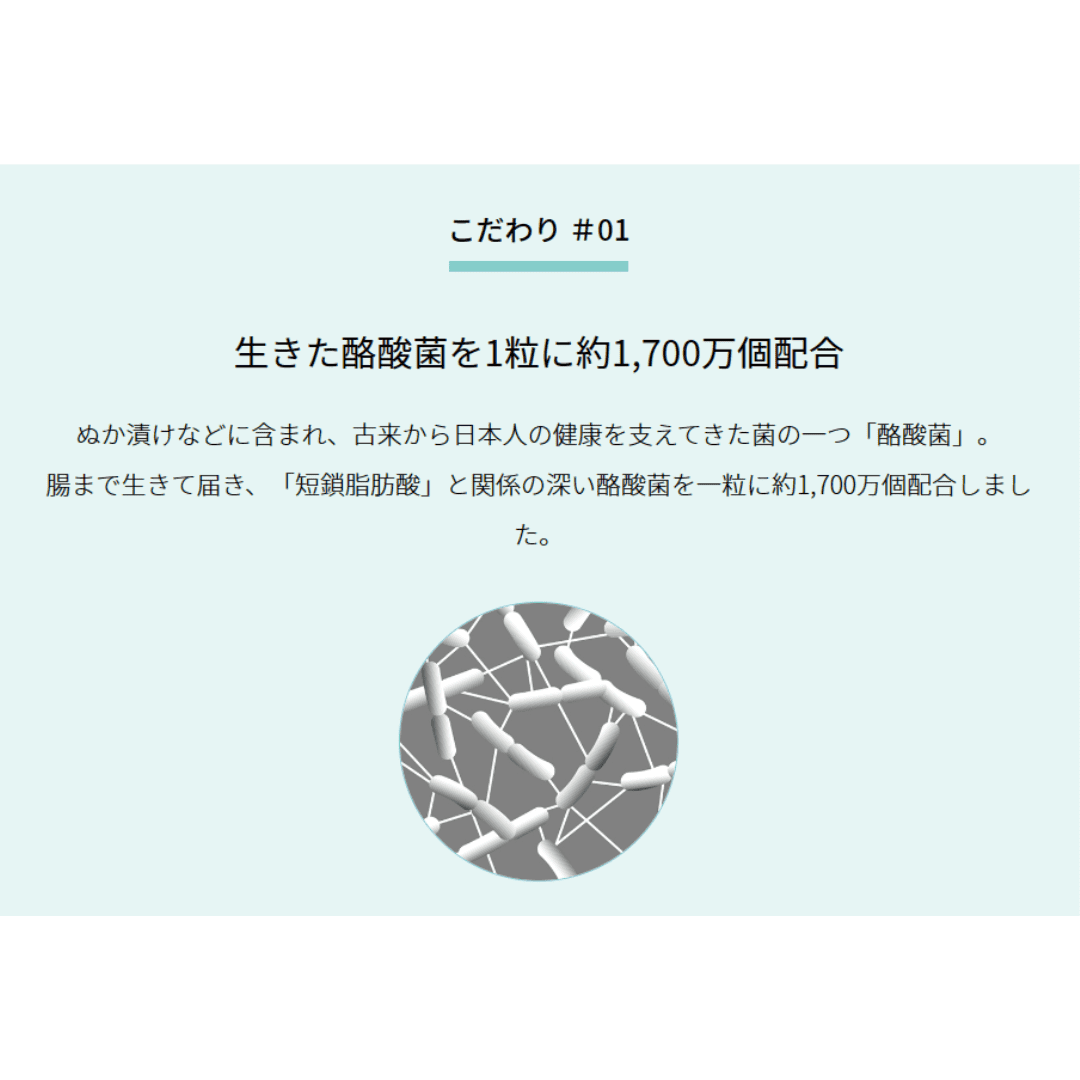 ぬか漬けなどに含まれる酪酸菌は、昔から日本人の健康を支えてきた菌です。ラクビには生きた酪酸菌が1粒あたり約1,700万個配合されています。