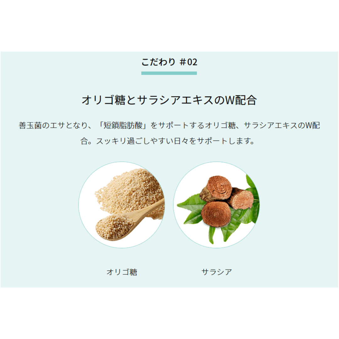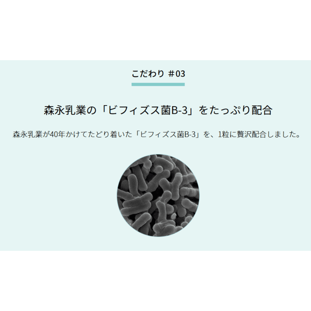 また、善玉菌のエサになって短鎖脂肪酸をサポートするオリゴ糖とサラシアエキスをダブルで配合しているため、毎日のスッキリをサポートしてくれます。さらに森永乳業が40年かけてたどり着いた「ビフィズス菌B-3」を1粒にたっぷり配合しています。