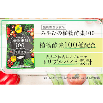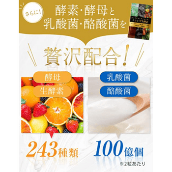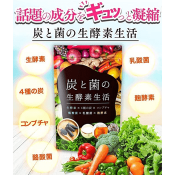 酵母や酵素が豊富に含まれるコンブチャ、クレンズ効果のある3種類のチャコール、234種類の生酵素、100億個の乳酸菌(2粒あたり)を配合した酵素サプリです。