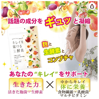 「キレイを届ける生酵素」は、3年間発酵・熟成させた75種類以上の酵素や9種類の穀物の麹菌・コンブチャ・食物繊維・乳酸菌・マルチビタミンを贅沢に配合した酵素サプリです。海外セレブが飲んでいると話題のコンブチャも含まれています。