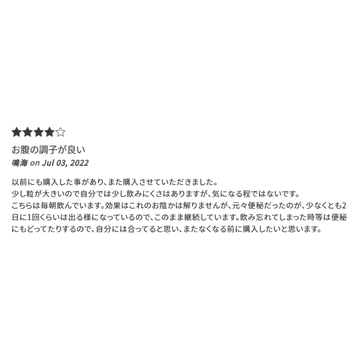 年末年始の食べ過ぎ用に購入しました。飲み忘れがないように一度に四粒を飲むようにしています。おなかの調子がよくなりました。