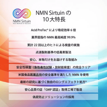 さらにNMN Sirtuin18000は安全性の高さにも定評があります。NMN Sirtuin18000は厚生労働省が作成したガイドラインにより運営される「GMP認定工場」にて製造されています。GMP認定工場で製造される製品は、各種検査や試験により高い品質が管理されているため、NMN Sirtuin18000も安心して飲むことができるのです。