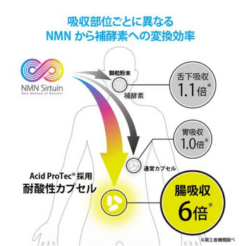NMNが腸まで届く耐酸性小型カプセルが採用されているため、同量のNMNが配合されたサプリに比べると吸収効率が6倍となっています。