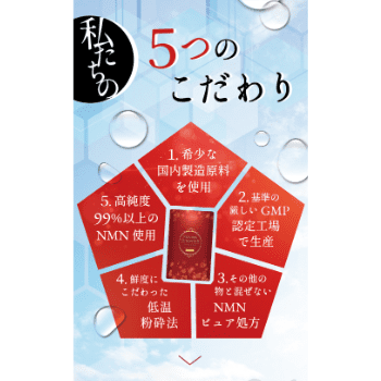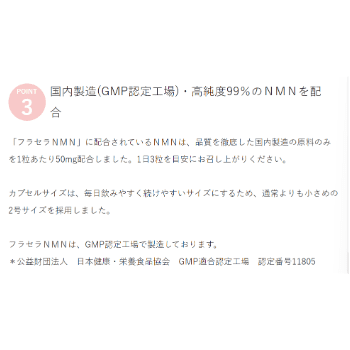ナダルタスのNMNは厳しく管理された食品工場で製造され、製剤化は通常の国内GMPよりも厳しい管理基準が求められるcGMP認証を取得した国内工場でおこなわれています。原材料から最終製品にいたるまで、全て国内で生産されているので安心感があります。