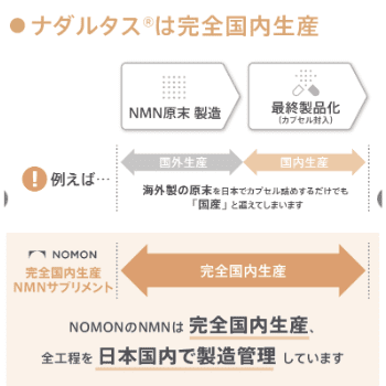 ナダルタスは帝人グループのNOMON株式会社が販売しているNMNサプリです。NMNは日本で酵母から生産されており、純度99%以上の安定性の高いNMNだけが配合されています。
