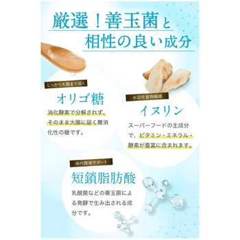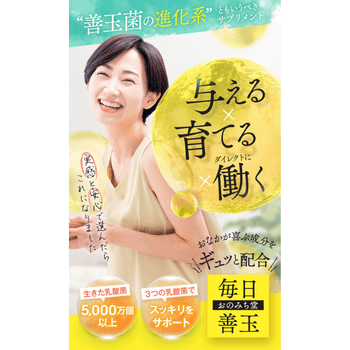 「毎日善玉」は、多種類の菌を多量に毎日摂ることができるサプリです。生きている菌「プロバイオティクス」、善玉菌のエサになって増殖や活性化を促す「プレバイオティクス」、乳酸菌生産物質の「バイオジェニックス」の3つの相乗作用により、体内バランスを整えます。乳酸菌生産物質として16種35株の乳酸菌・ビフィズス菌が作り出す成分が配合されており、善玉菌を増やして悪玉菌を減らす働きをします。その他にも水溶性食物繊維やビタミン・ミネラルなど栄養素を豊富に含み、体内バランスを整えてくれます。
