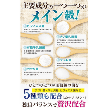 - 乳酸菌(殺菌)粉末(国内製造)、乳酸菌凍結乾燥末(乳成分を含む)、有胞子性乳酸菌(乳成分を含む)、ザクロ濃縮果汁パウダー、乳酸菌混合粉末(加熱菌体)(乳成分を含む)、納豆菌末、ビフィズス菌凍結乾燥末、酢酸菌末(大豆・乳成分を含む)、大豆エキス発酵物加工食品(大豆を含む)、米胚芽・大豆発酵抽出物・植物抽出物加工食品(大豆を含む)、米糠・大豆エキス納豆菌発酵物加工食品(大豆を含む)・小麦若葉粉末、フラクトオリゴ糖、ガラクトオリゴ糖、イソマルトオリゴ糖粉あめ、コラーゲンペプチド(ゼラチンを含む)、エスラチン(魚由来)、ツバメ巣加工品、紅麹、難消化性デキストリン、ポリデキストロース、キヌア発芽粉末、アサイー凍結乾燥粉末、カムカム果汁粉末、ブラックジンジャー抽出物/結晶セルロース、ステアリン酸Ca、シェラック、微粒二酸化ケイ素、V.B6、ヒアルロン酸、ラクトフェリン(乳由来)、キトサン